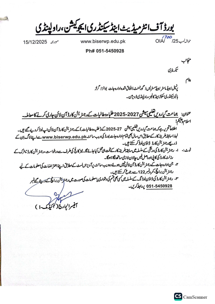 According to the official notification, BISE Rawalpindi has issued Class 11 registration cards online for students of the 2025–2027 session. Educational institutions can now access and download these cards directly from the board’s official website.